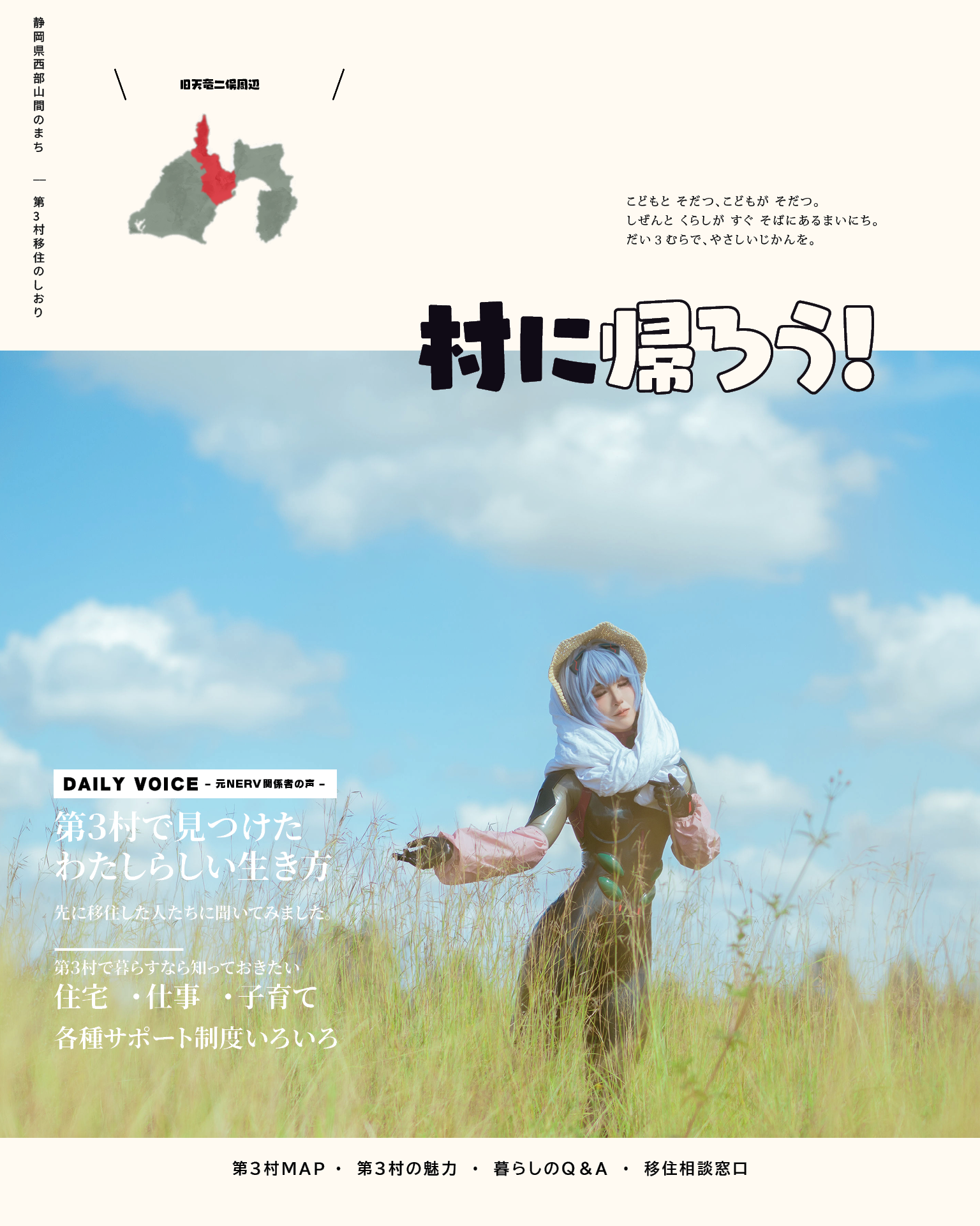This cosplay photoset experiments with presenting these standalone images, reimagined as a rural relocation campaign, inspired by Hideaki Anno’s anime series: Neon Genesis Evangelion.